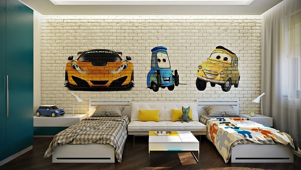 Детскую можно оформить в белом цвете, а из белого кирпича создать акцентную стену. Кирпичная стена будет гармонично сочетаться с яркой детской мебелью и сделает интерьер стильным.